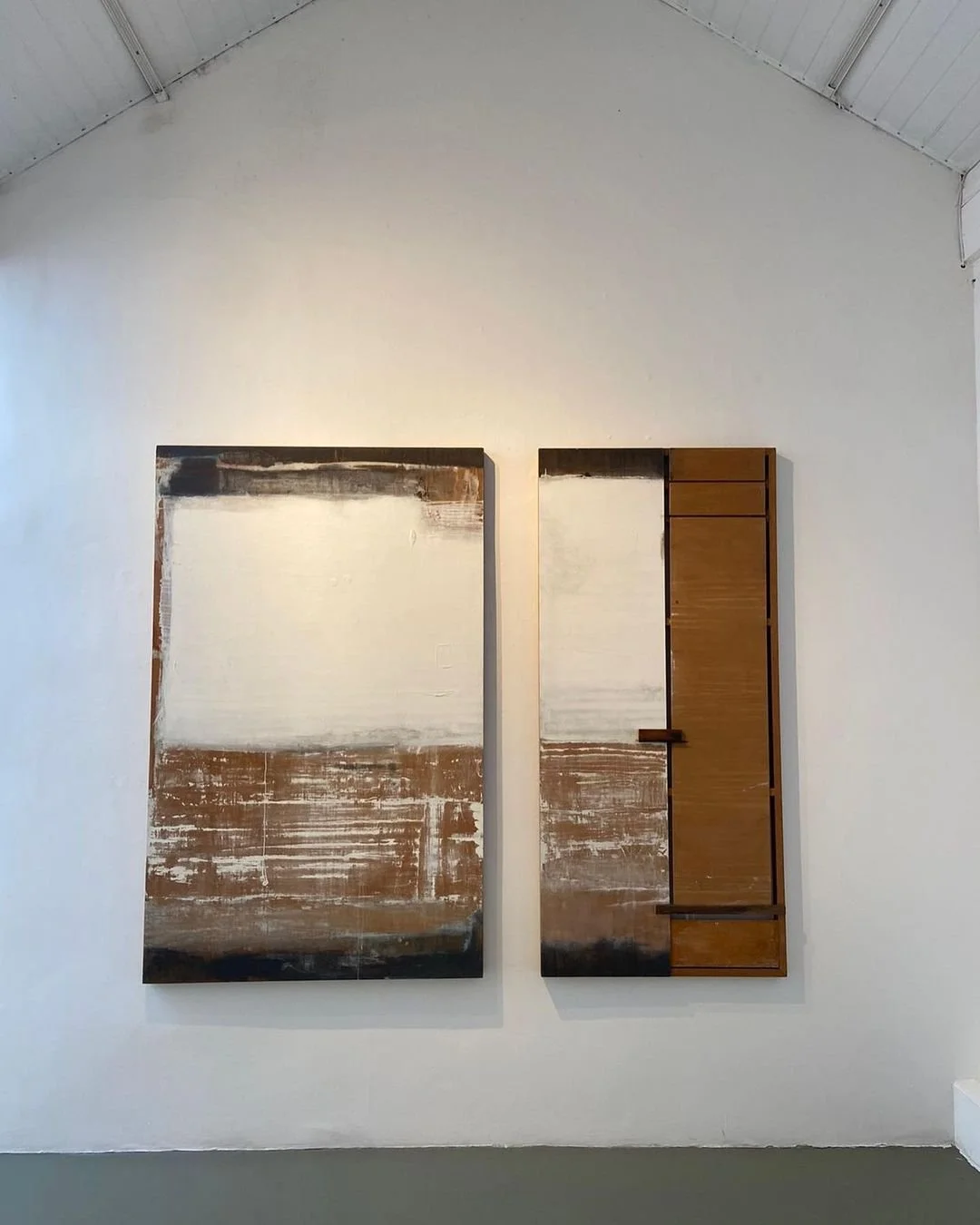 Na primeira imagem, é possível observar o trabalho de Ana Muglia, onde a partir de uma reflexão pictórica a partir dos elementos mais primitivos da construção civil, nos convida a criar um olhar para elementos rudimentares. A obra também foi apresentada no Paço Imperial do Rio de Janeiro.