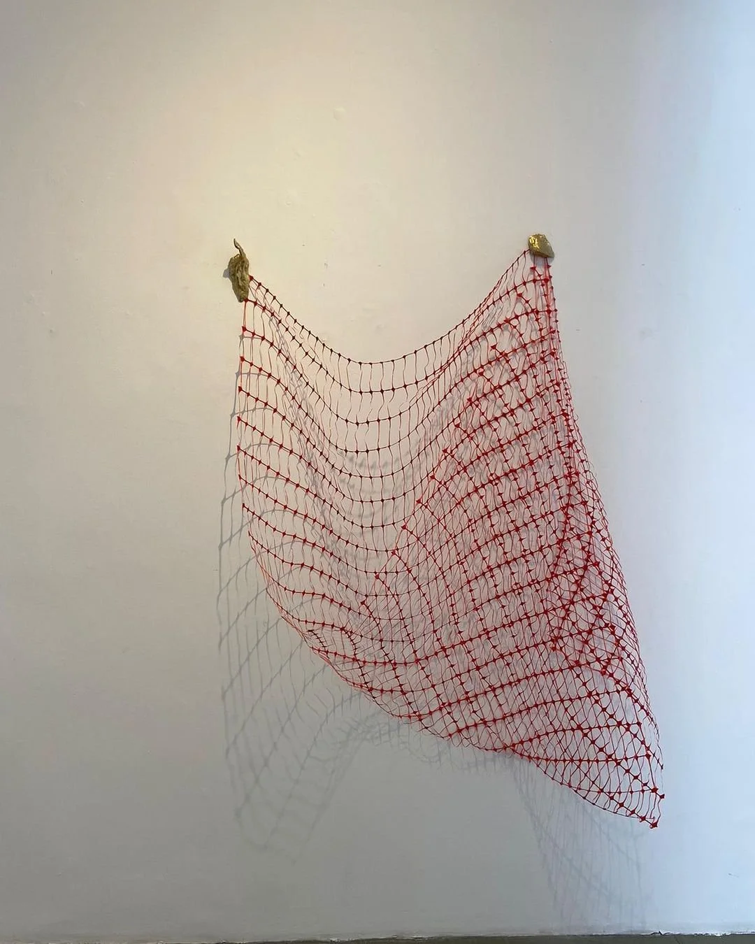 Já na segunda imagem, apresentamos um contraponto através do trabalho da Rosana Naday, que, a partir da observação de um elemento também rudimentar em uma obra, percebe que essa grande rede constrói um imaginário arquitetônico. A partir dela, cria um grande objeto, estabelecendo com os pinos fundidos a definição da estrutura.