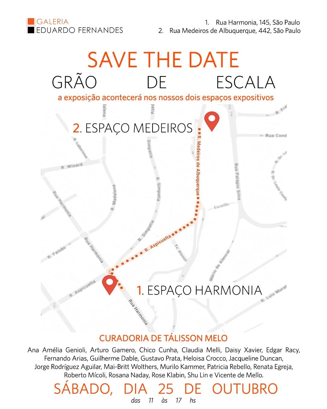 No dia 25 de outubro deste ano, a Galeria Eduardo Fernandes inaugura sua expansão em novo espaço com a exposição coletiva "Grão de escala". A curadoria a cargo de Tálisson Melo foi desenvolvida para confluir trabalhos dos 21 artistas representados pela galeria nos últimos anos: Ana Amélia Genioli, Arturo Gamero, Chico Cunha, Claudia Melli, Daisy Xavier, Edgar Racy, Fernando Arias, Guilherme Dable, Gustavo Prata, Heloisa Crocco, Jacqueline Duncan, Jorge Rodríguez Aguilar, Luz Lizarazo, Mai-Britt Wolthers, Patricia Rebello, Renata Egreja, Roberto Mícoli, Rosana Naday, Rose Klabin, Shu Lin e Vicente de Mello. Essa exposição coletiva marca uma nova fase na trajetória da galeria que também celebra vinte (20) anos de atividades.