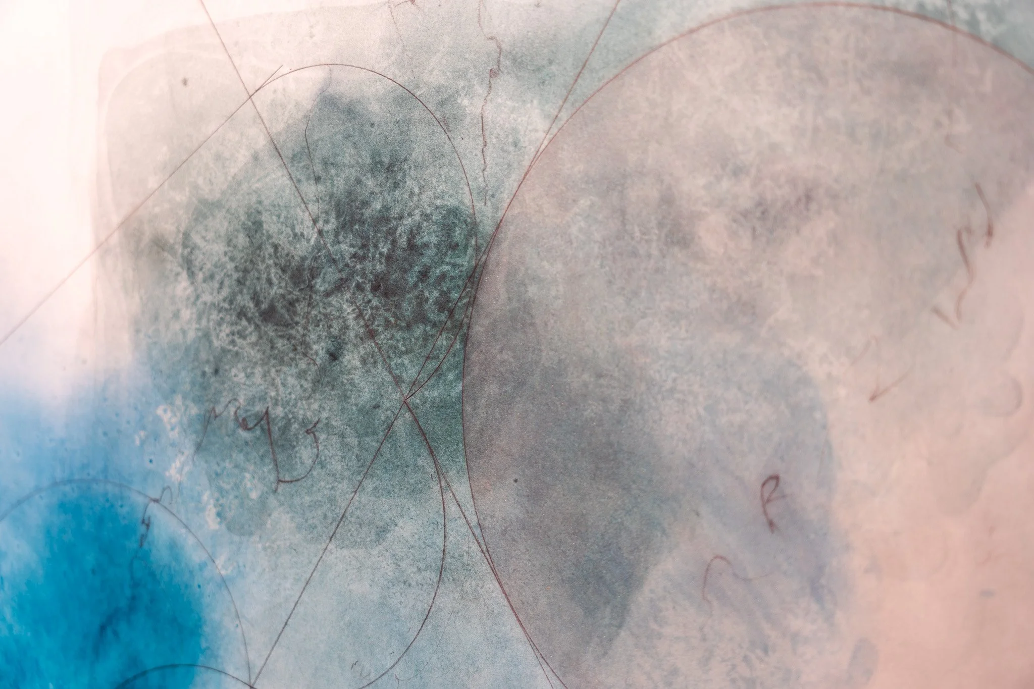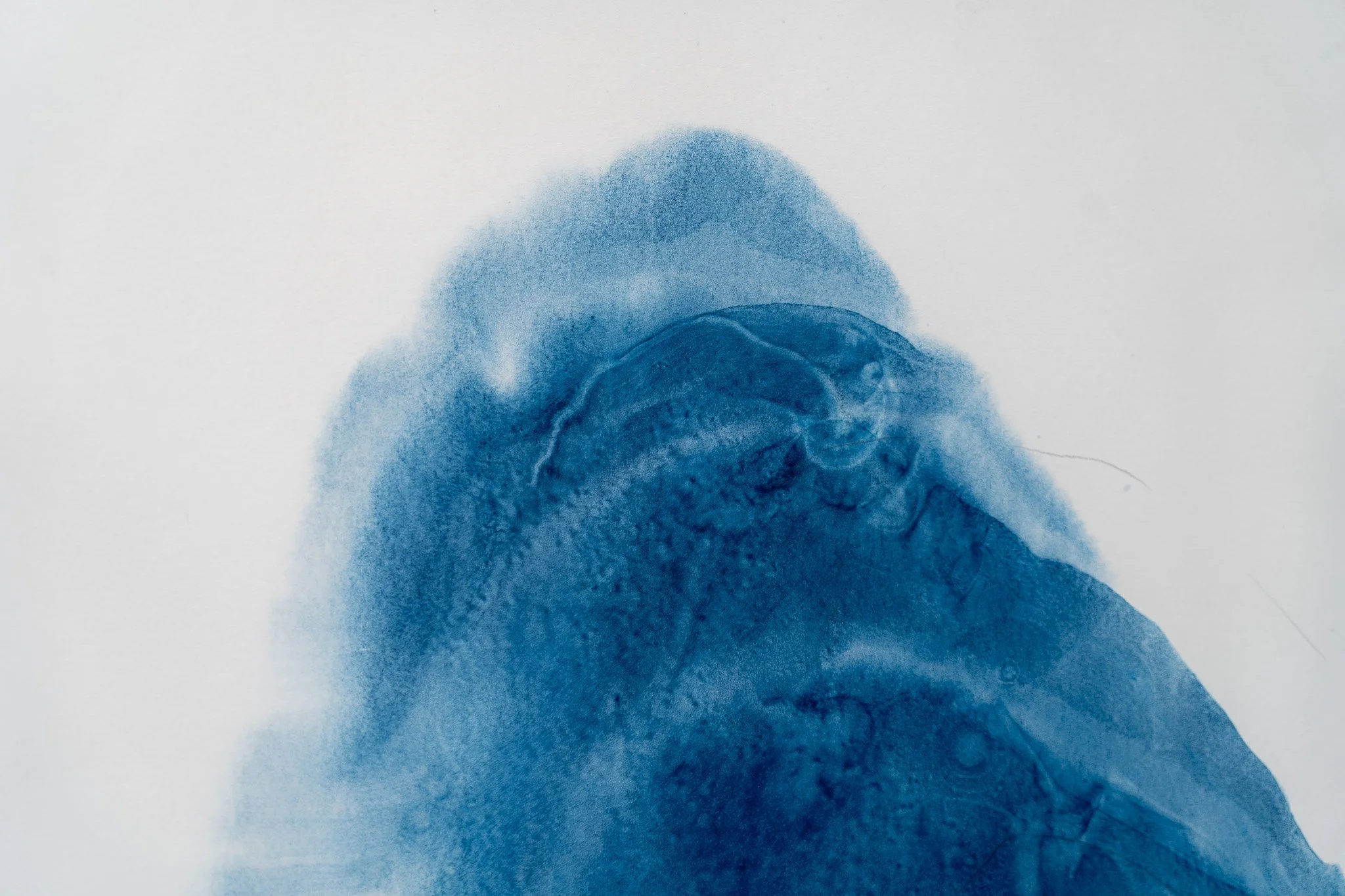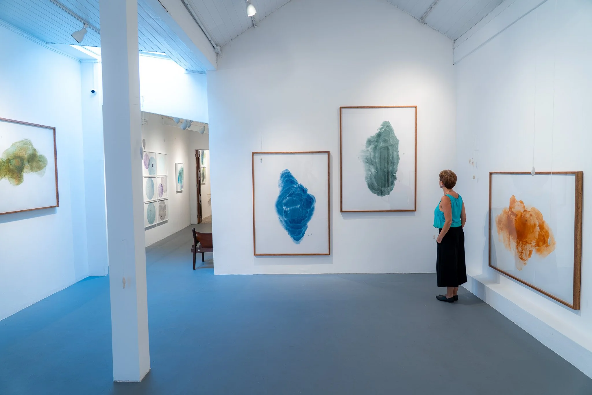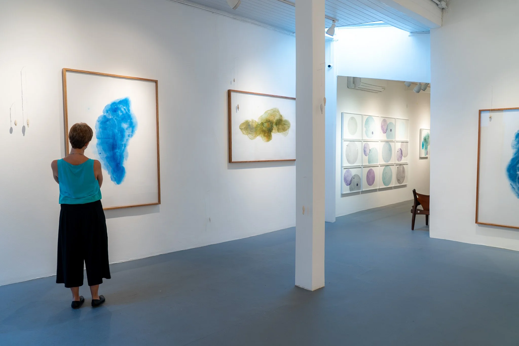 Grandes campos cromáticos evocam paisagens ambíguas, ilhas, geleiras, crateras, galáxias ou células. A escala é instável e impede leituras unívocas. O gesto da artista constrói superfícies nas quais profundidade e planaridade coexistem, afirmando o papel não como suporte frágil, mas como campo de intensidade e resistência.