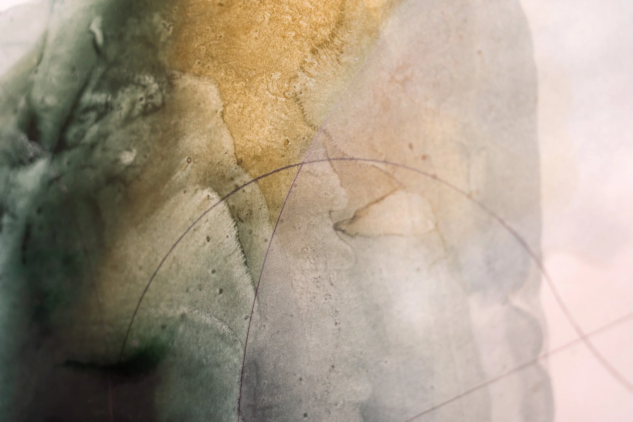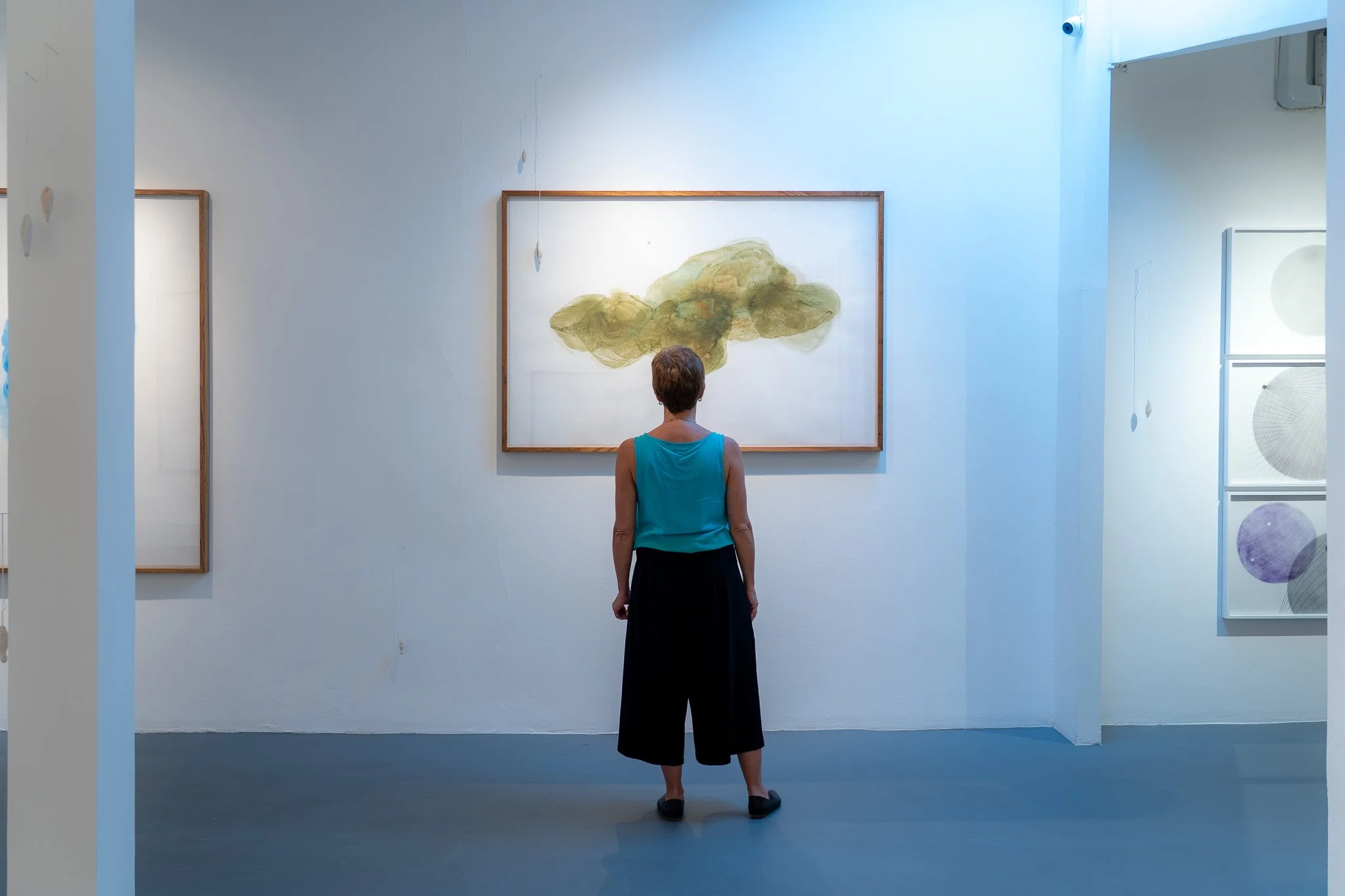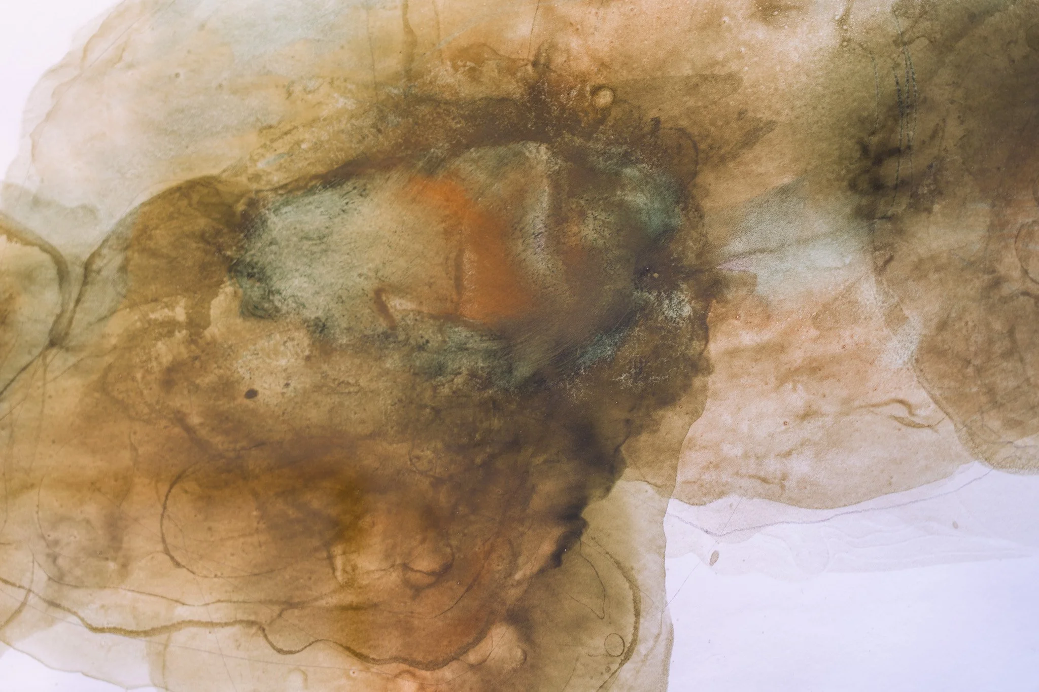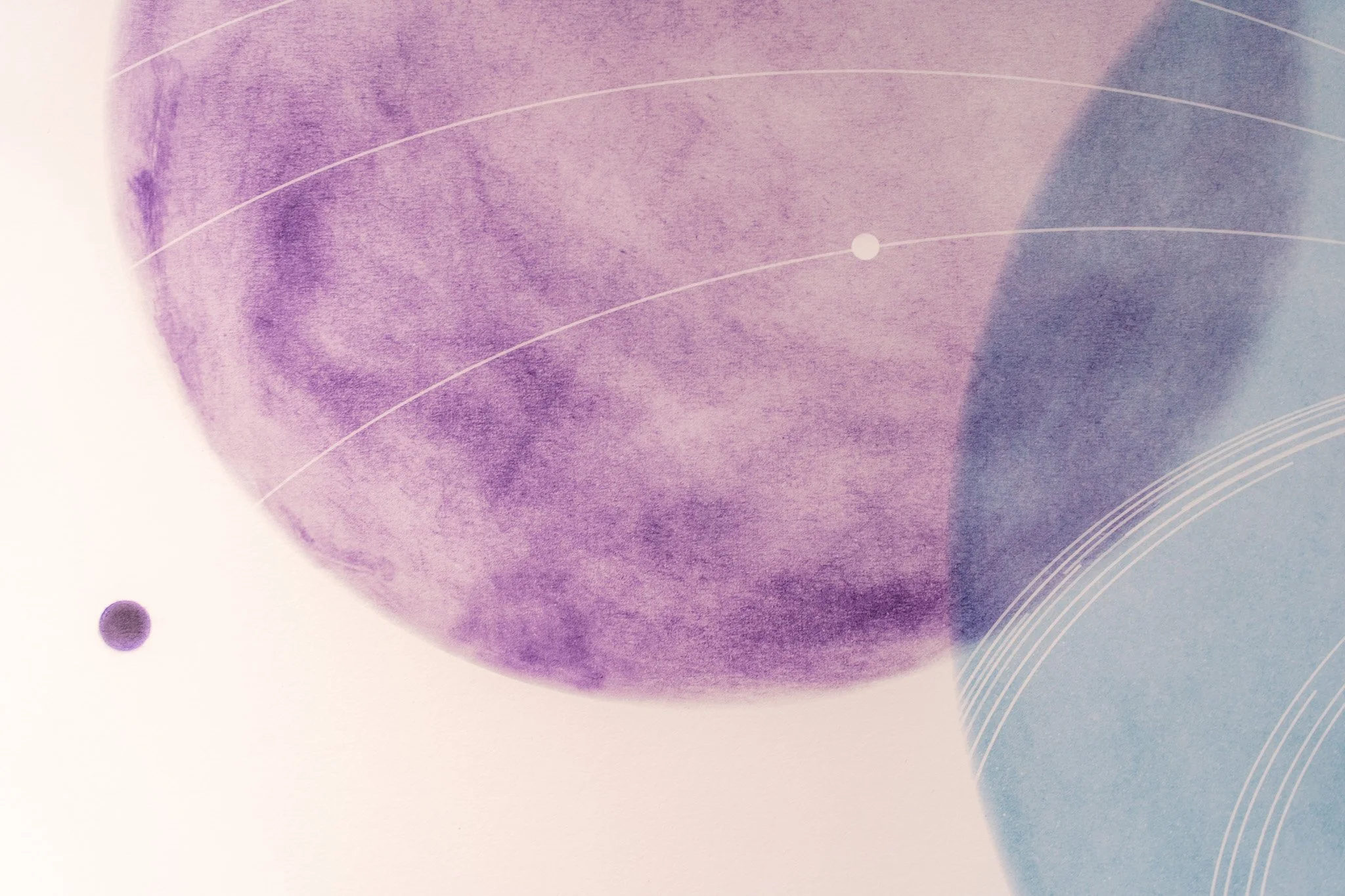 Grandes campos cromáticos evocam paisagens ambíguas, ilhas, geleiras, crateras, galáxias ou células. A escala é instável e impede leituras unívocas. O gesto da artista constrói superfícies nas quais profundidade e planaridade coexistem, afirmando o papel não como suporte frágil, mas como campo de intensidade e resistência.