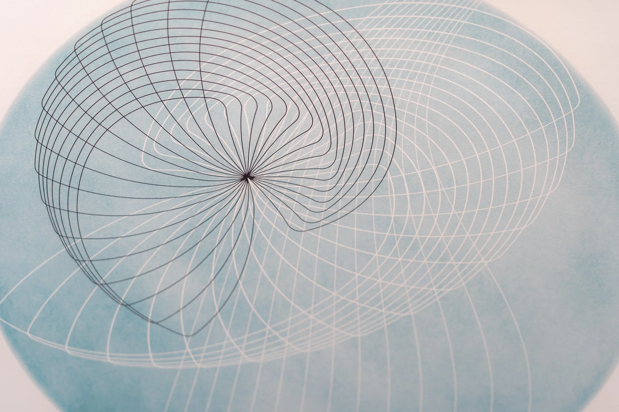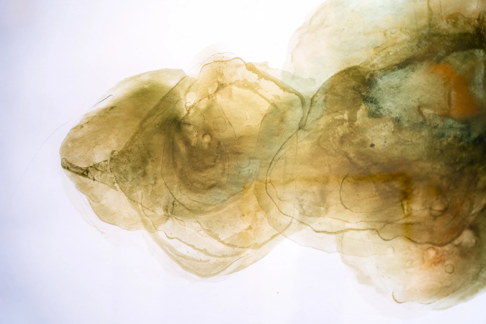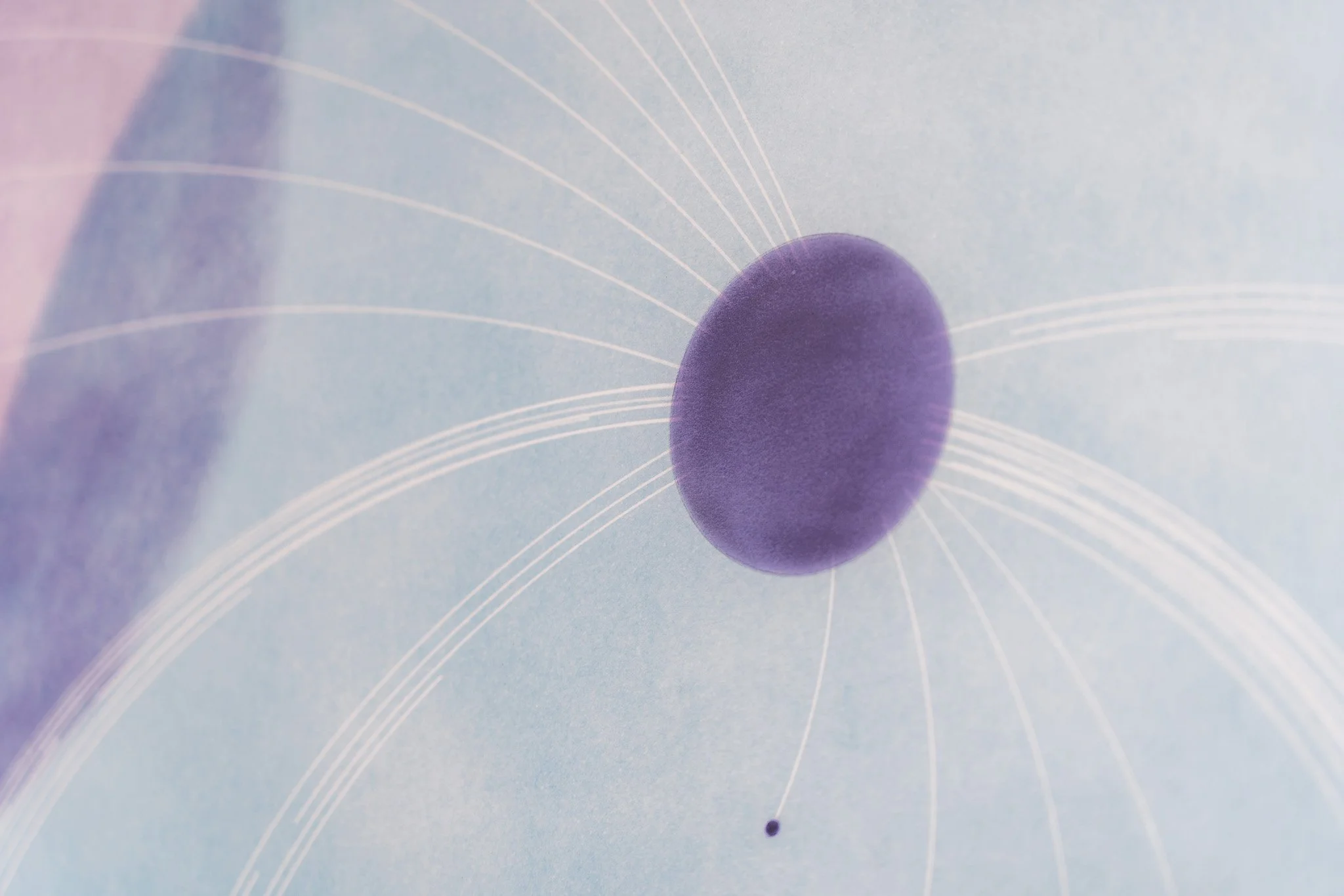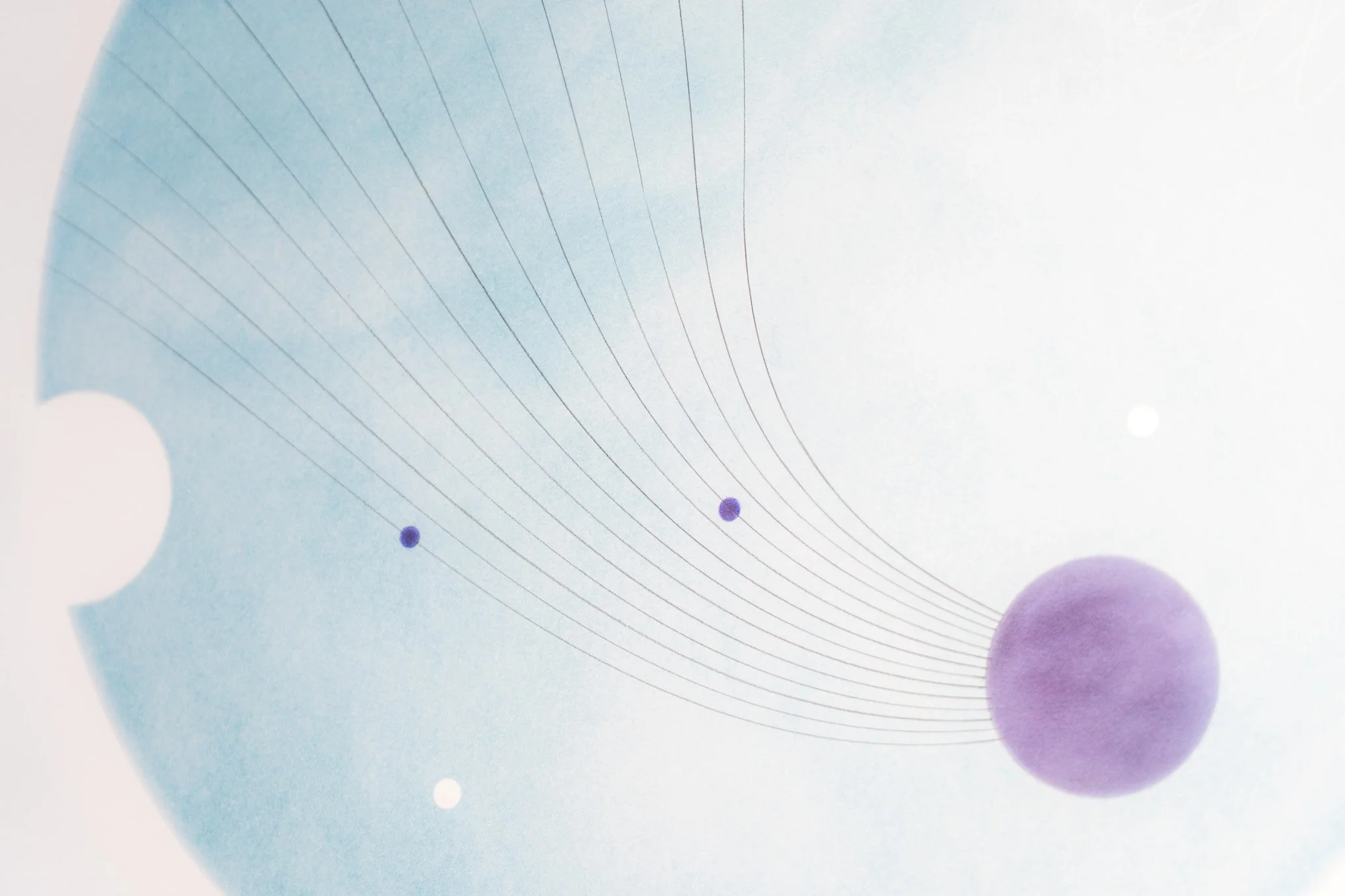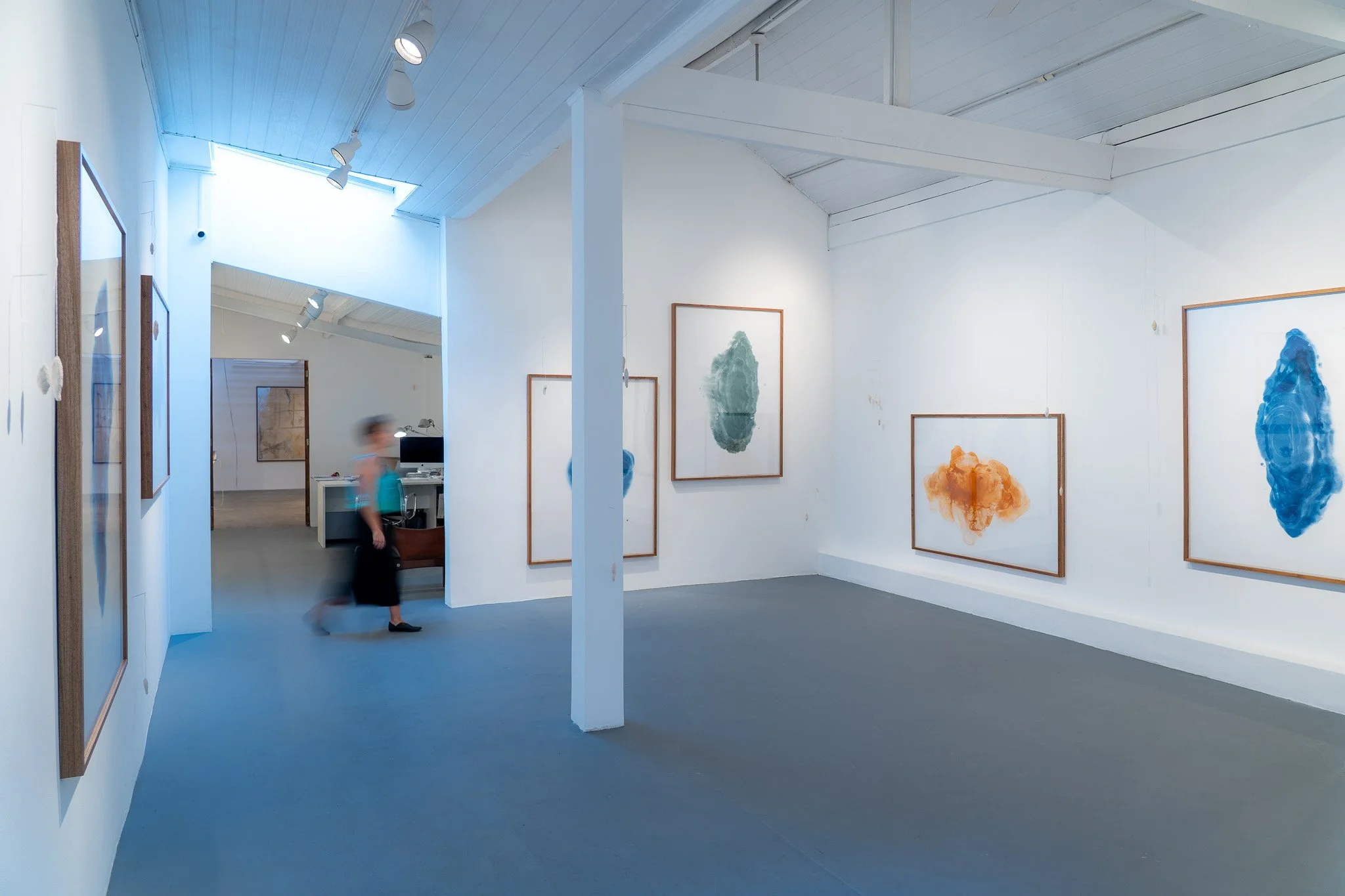 Grandes campos cromáticos evocam paisagens ambíguas, ilhas, geleiras, crateras, galáxias ou células. A escala é instável e impede leituras unívocas. O gesto da artista constrói superfícies nas quais profundidade e planaridade coexistem, afirmando o papel não como suporte frágil, mas como campo de intensidade e resistência.