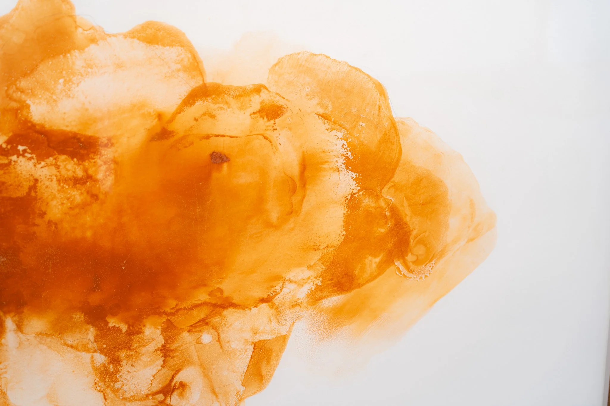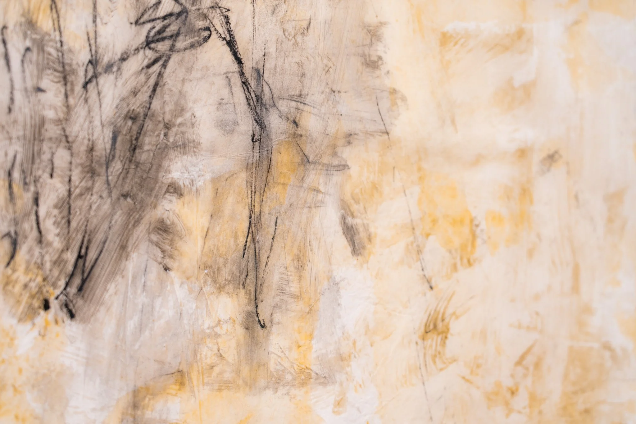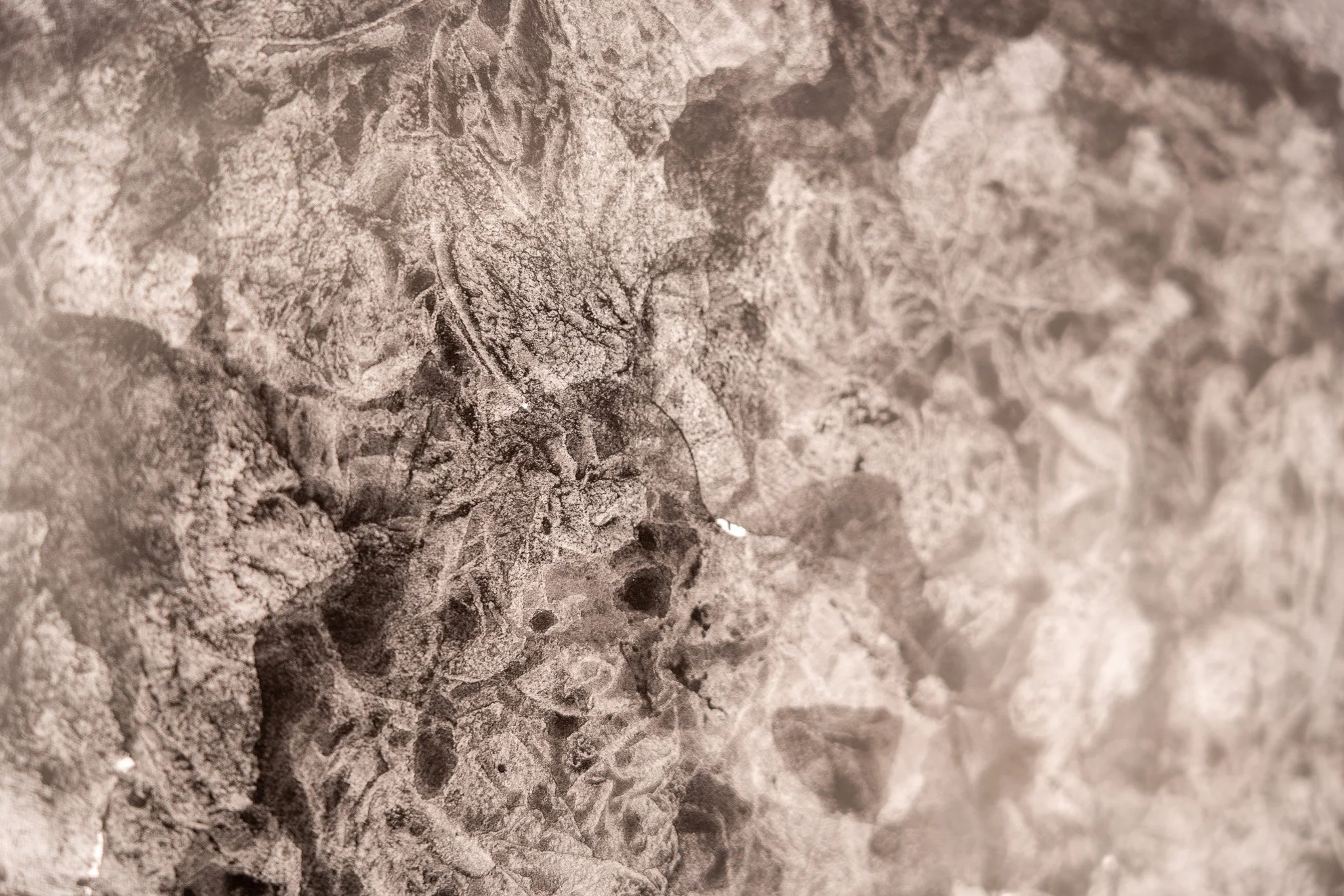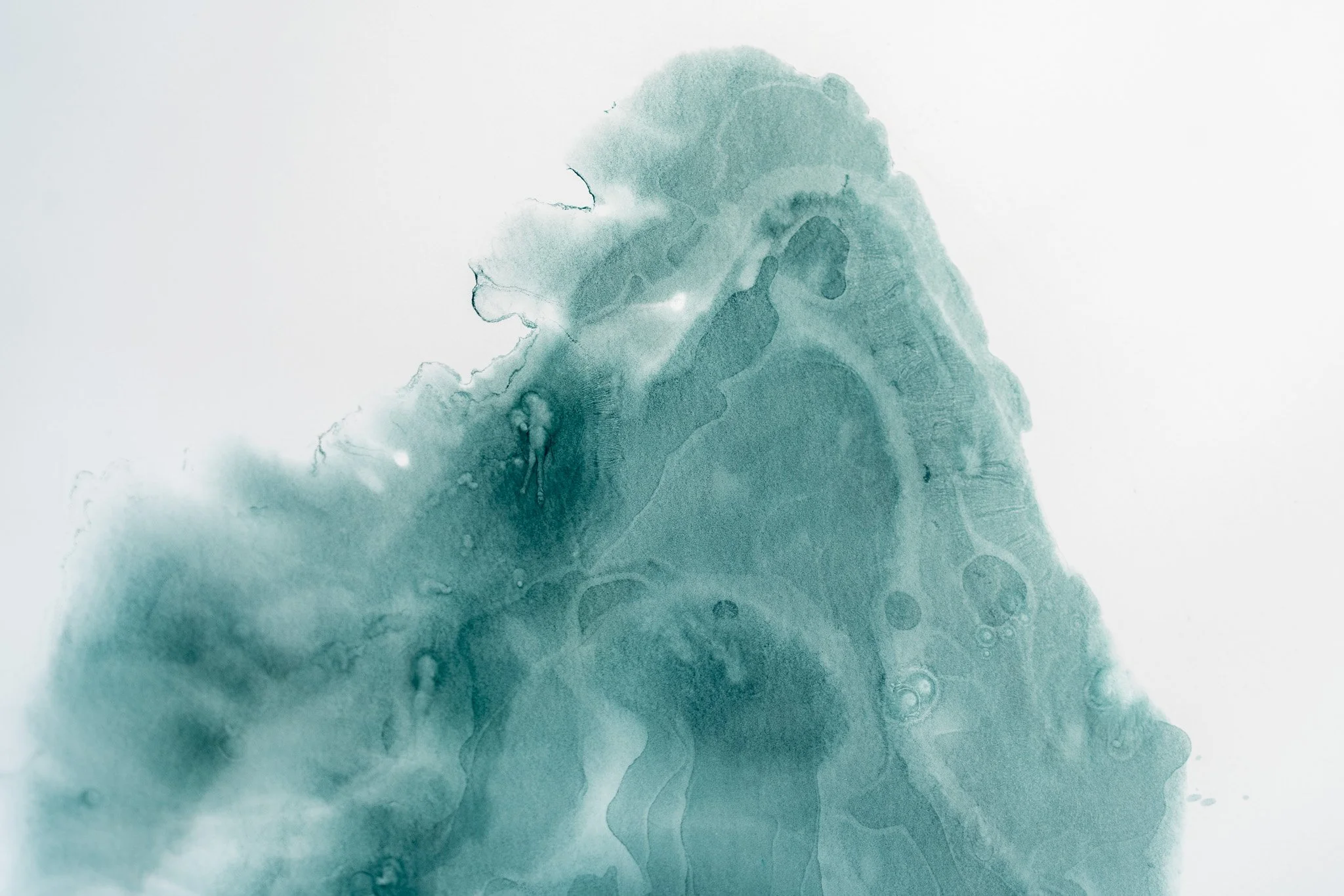 Grandes campos cromáticos evocam paisagens ambíguas, ilhas, geleiras, crateras, galáxias ou células. A escala é instável e impede leituras unívocas. O gesto da artista constrói superfícies nas quais profundidade e planaridade coexistem, afirmando o papel não como suporte frágil, mas como campo de intensidade e resistência.