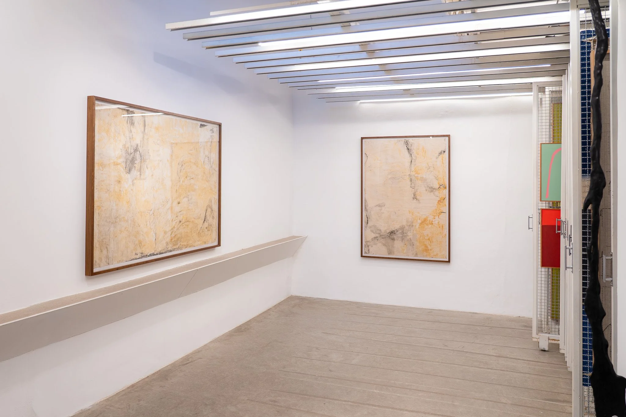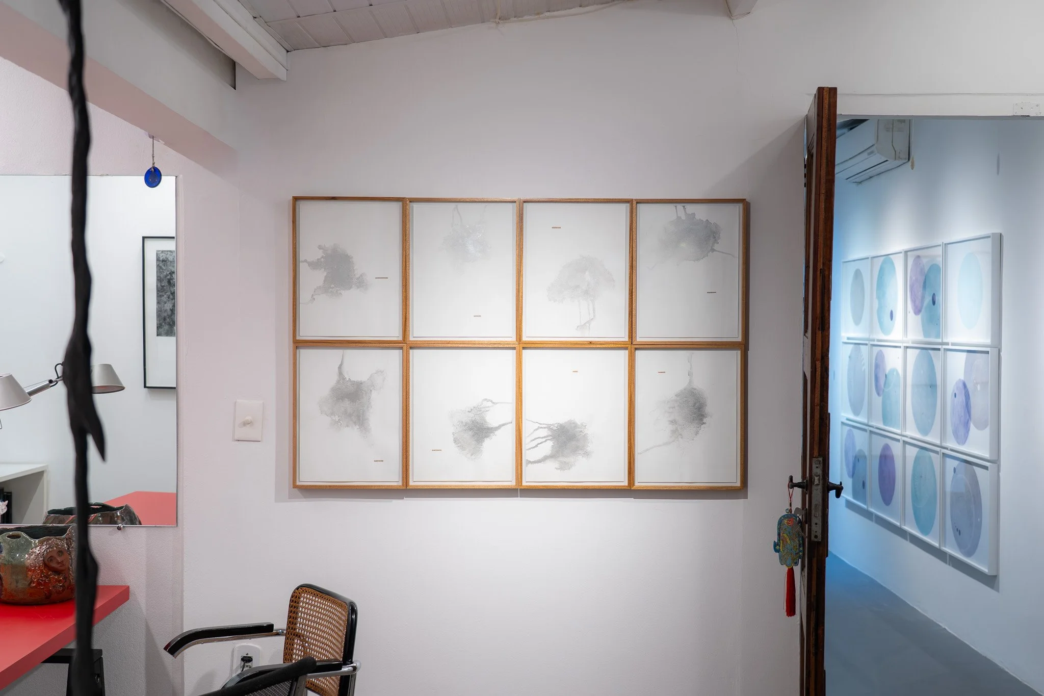 A exposição inclui ainda pequenos casulos suspensos no espaço, produzidos por artesãos da comunidade Kogi, na Colômbia. Esses elementos tridimensionais prolongam a reflexão sobre estados de latência e passagem. O casulo, forma provisória por excelência, afirma a transitoriedade como potência.