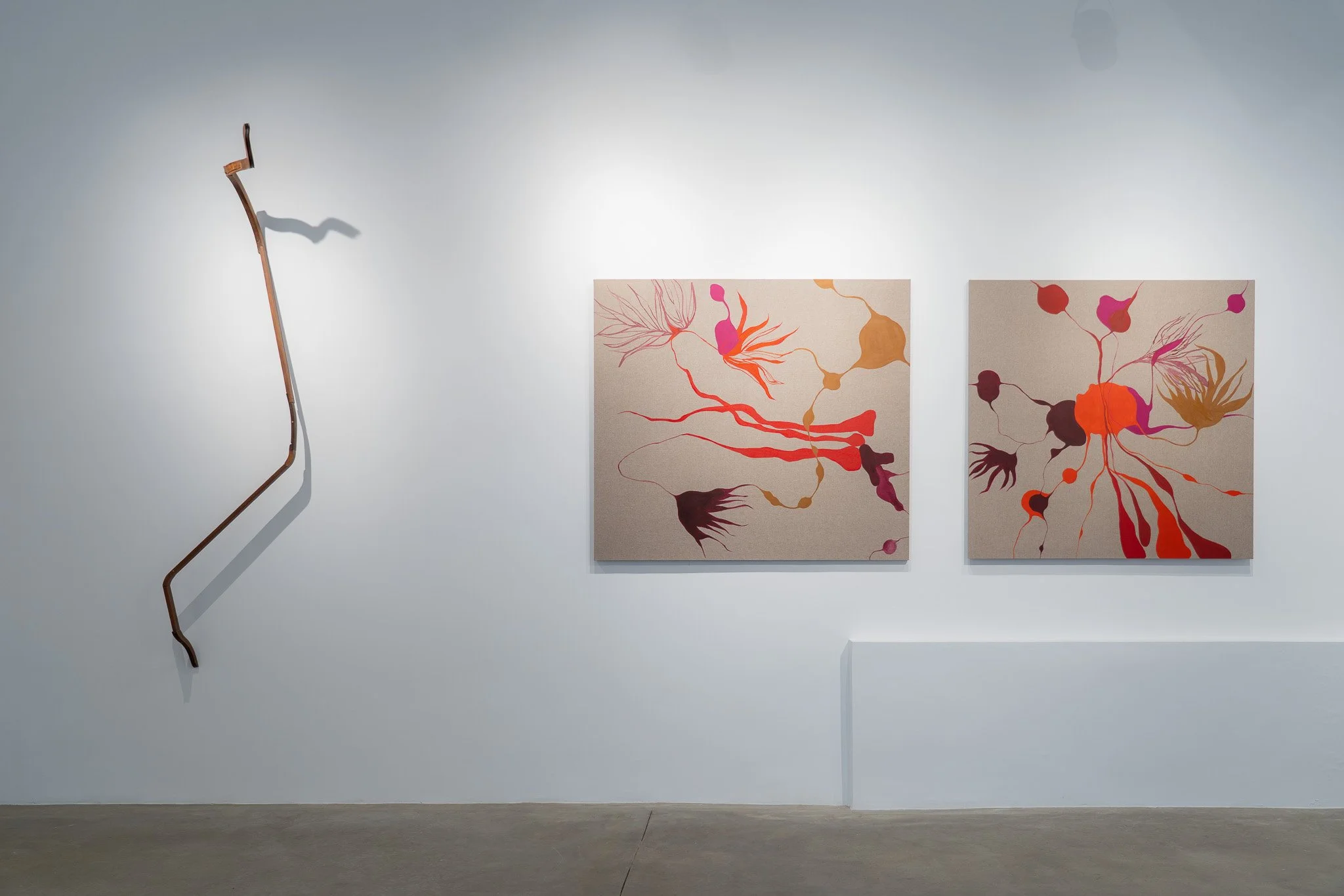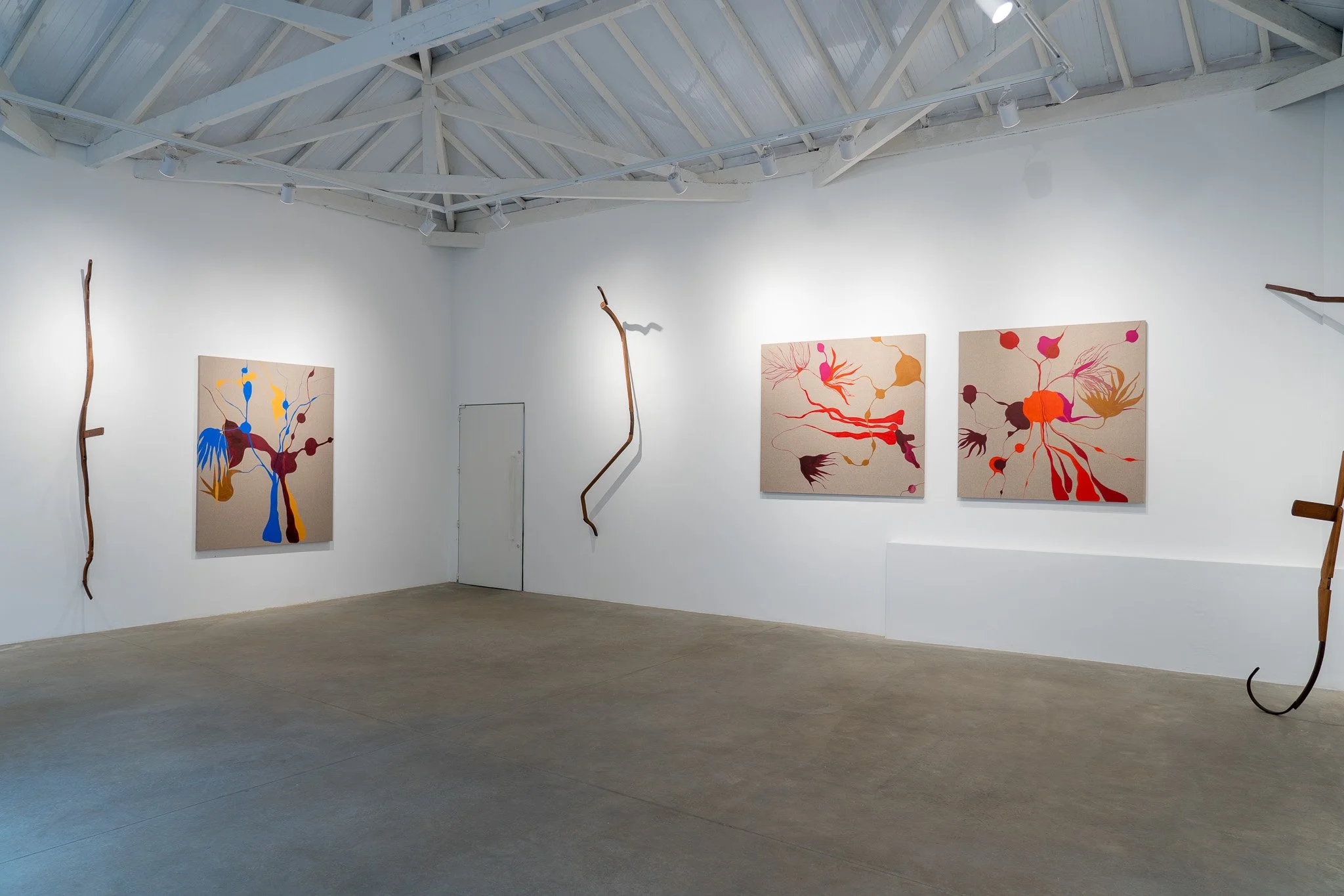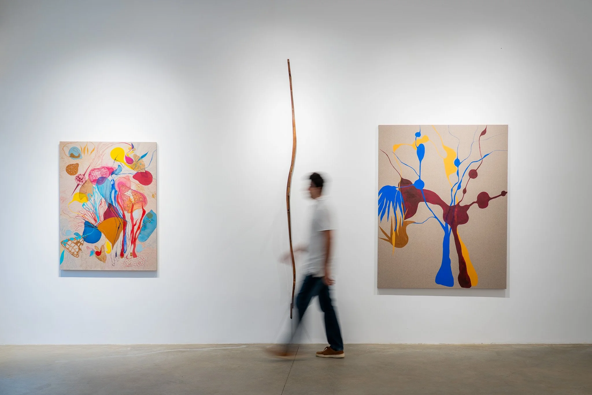 Verticalizadas e expansivas, as composições parecem exceder os limites físicos do suporte, aspirando a uma condição quase atmosférica. A pintura, aqui, não se encerra na tela, ela se difunde e convoca o espectador a participar de seu processo.