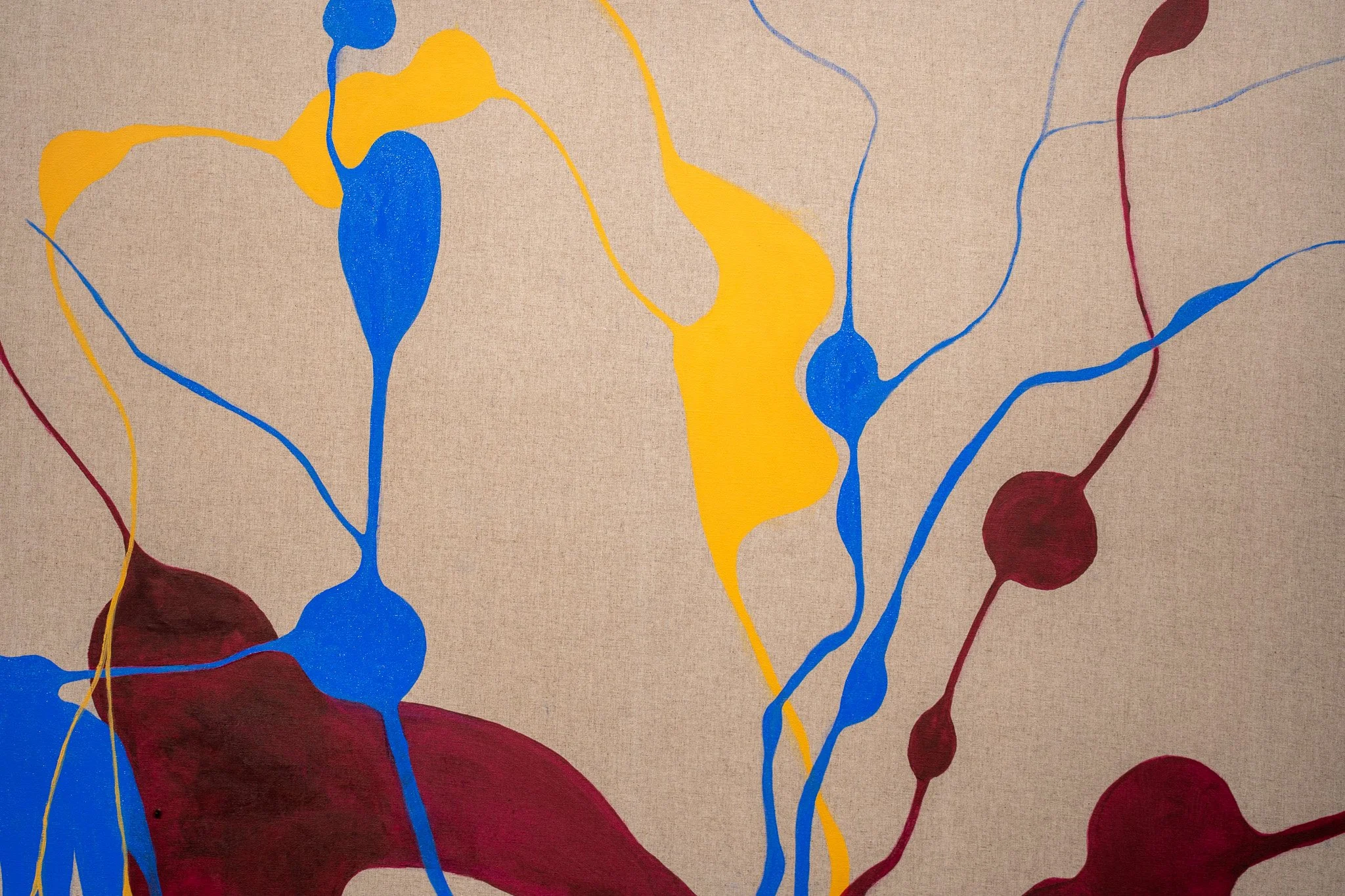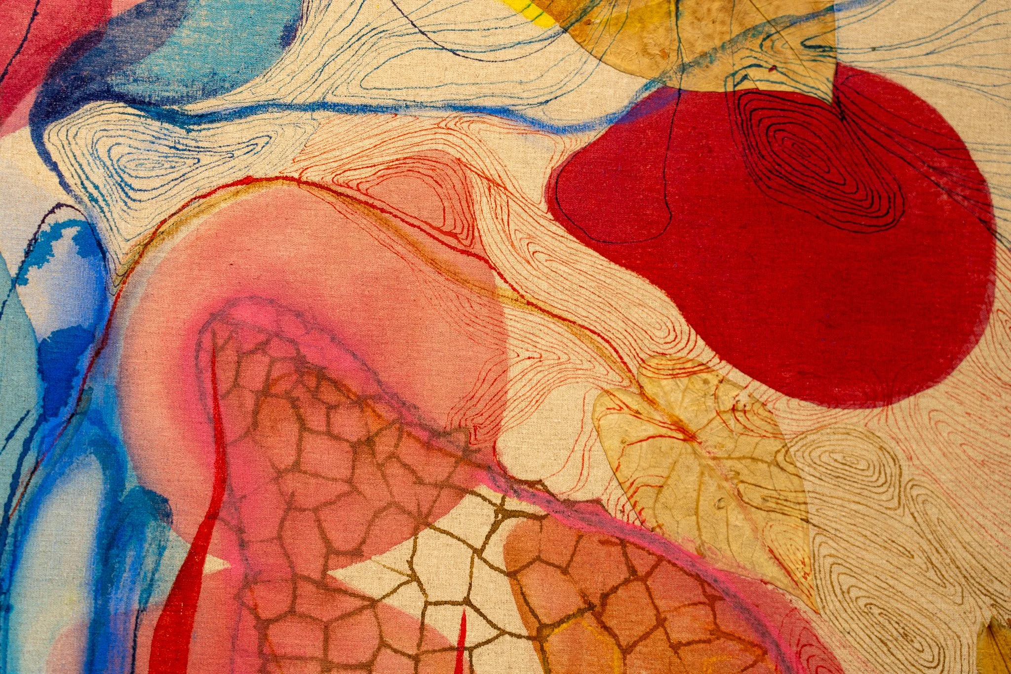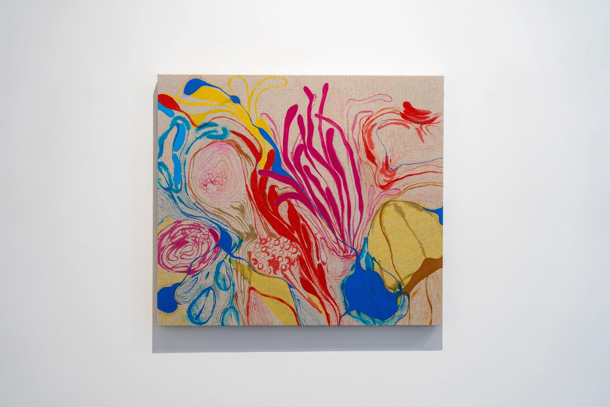 A escolha do linho estabelece diálogo com a tradição pictórica, enquanto a introdução de nanquim, ecoline e aquarela tensiona essa herança. A superfície torna-se vibrátil, sujeita a fluxos e contaminações, onde controle e acaso coexistem. A pintura emerge como território híbrido, simultaneamente preciso e instável.
