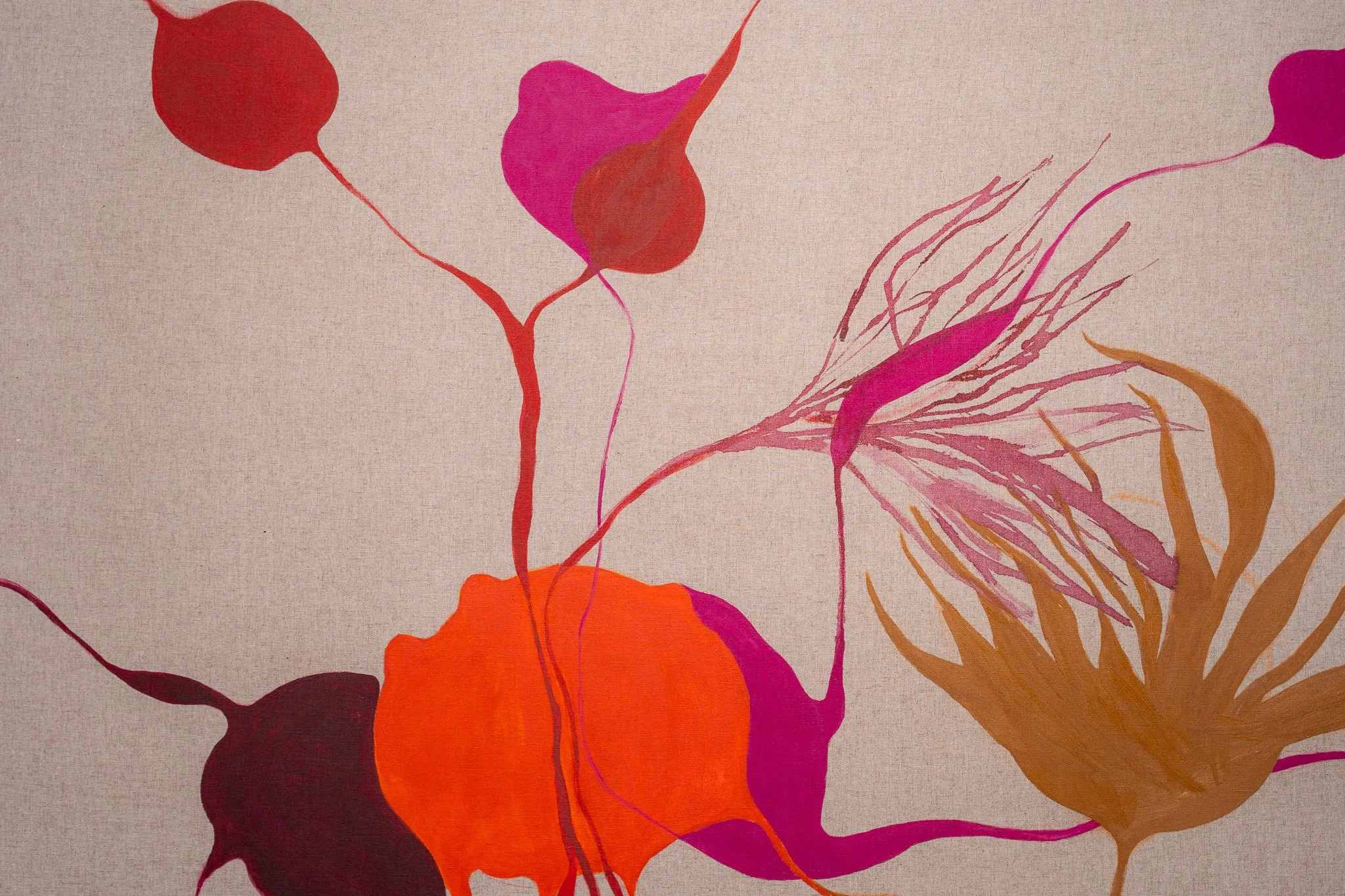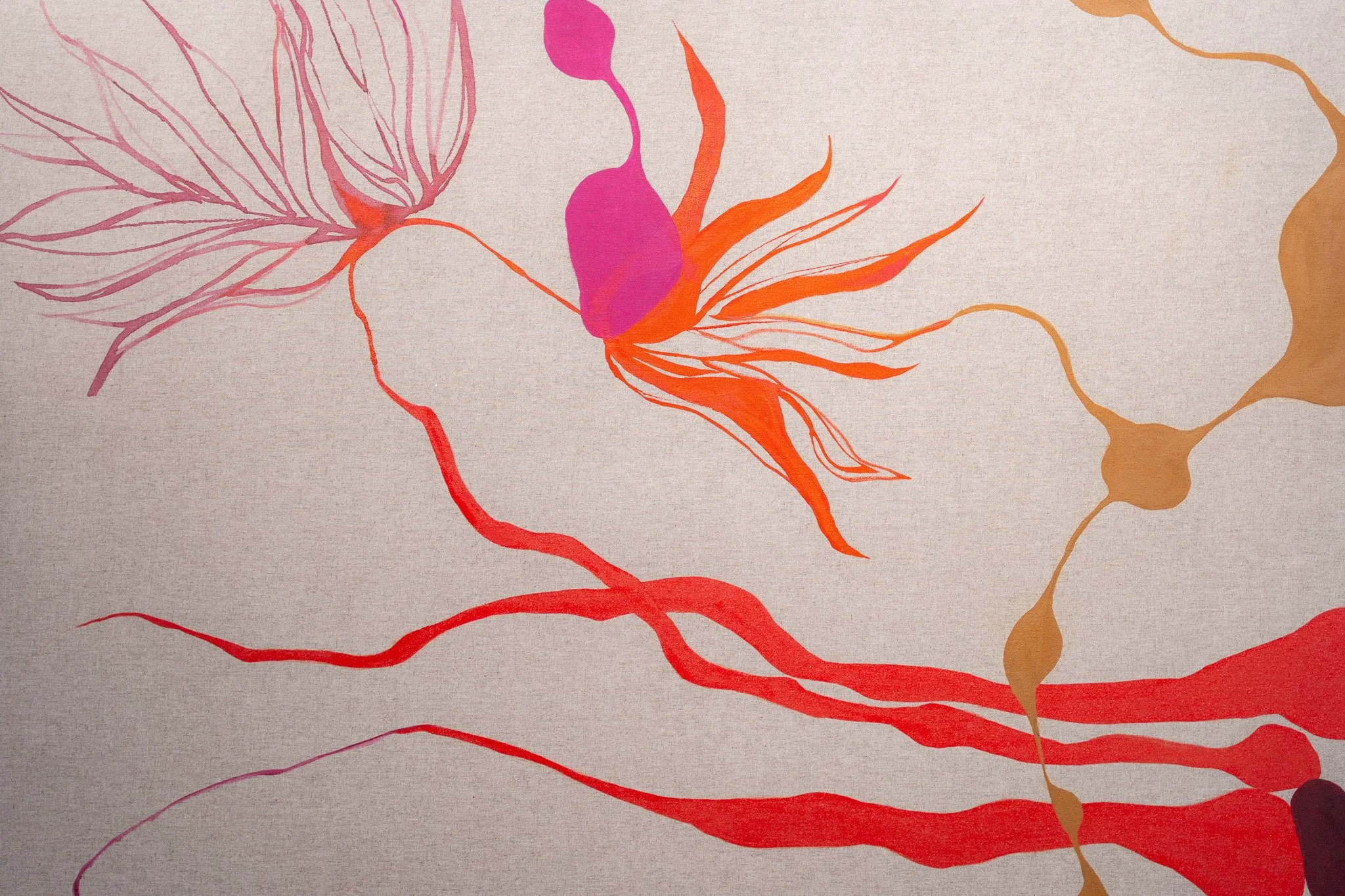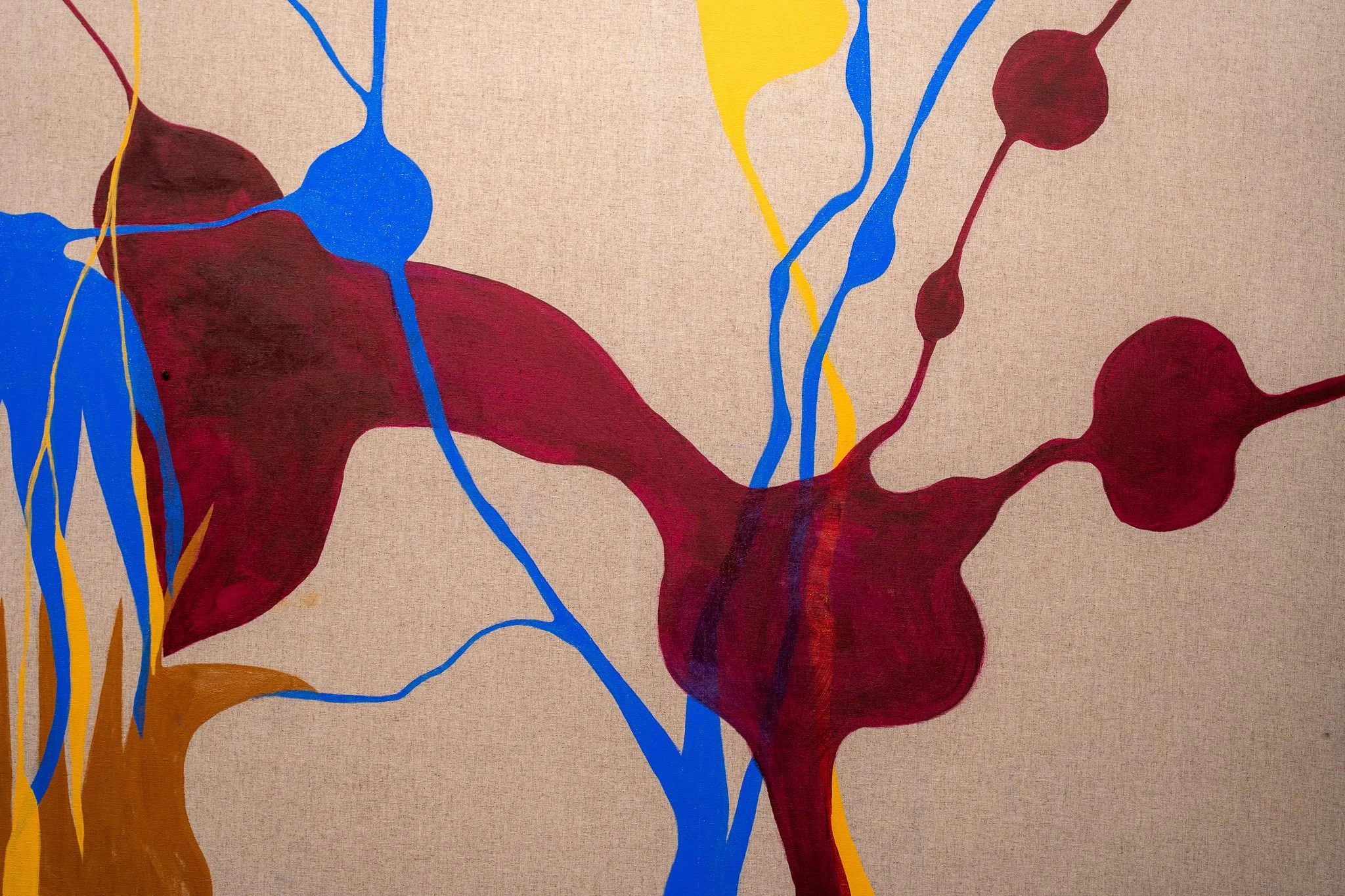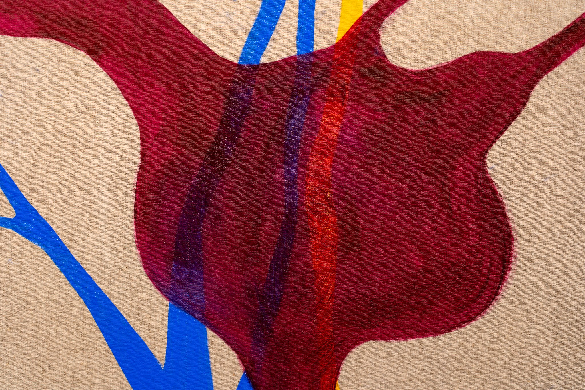 A escolha do linho estabelece diálogo com a tradição pictórica, enquanto a introdução de nanquim, ecoline e aquarela tensiona essa herança. A superfície torna-se vibrátil, sujeita a fluxos e contaminações, onde controle e acaso coexistem. A pintura emerge como território híbrido, simultaneamente preciso e instável.