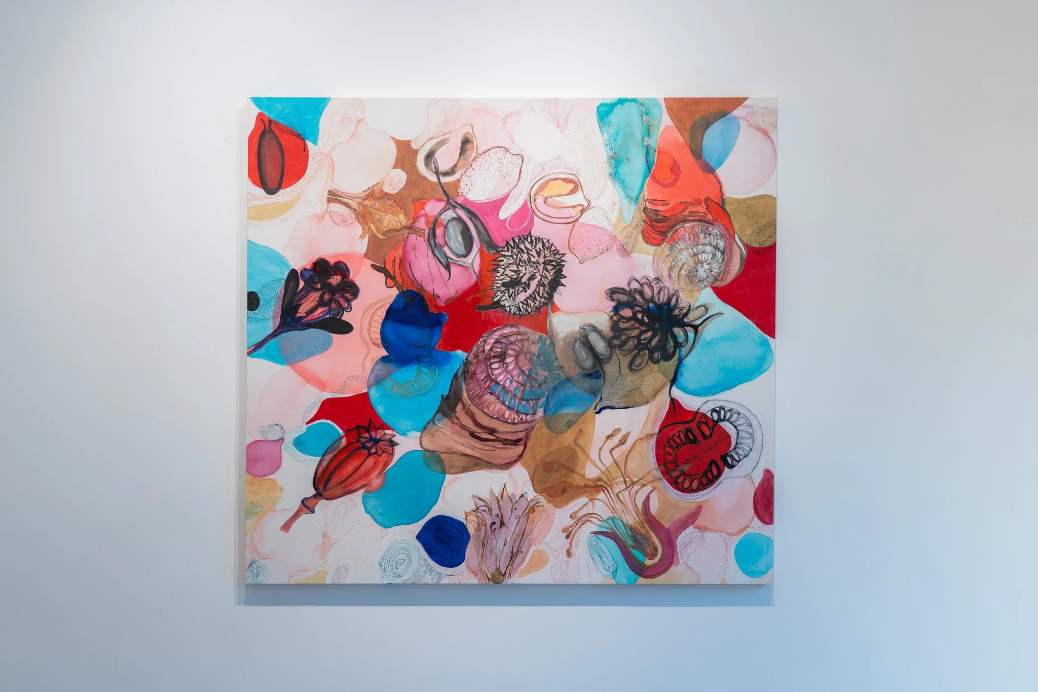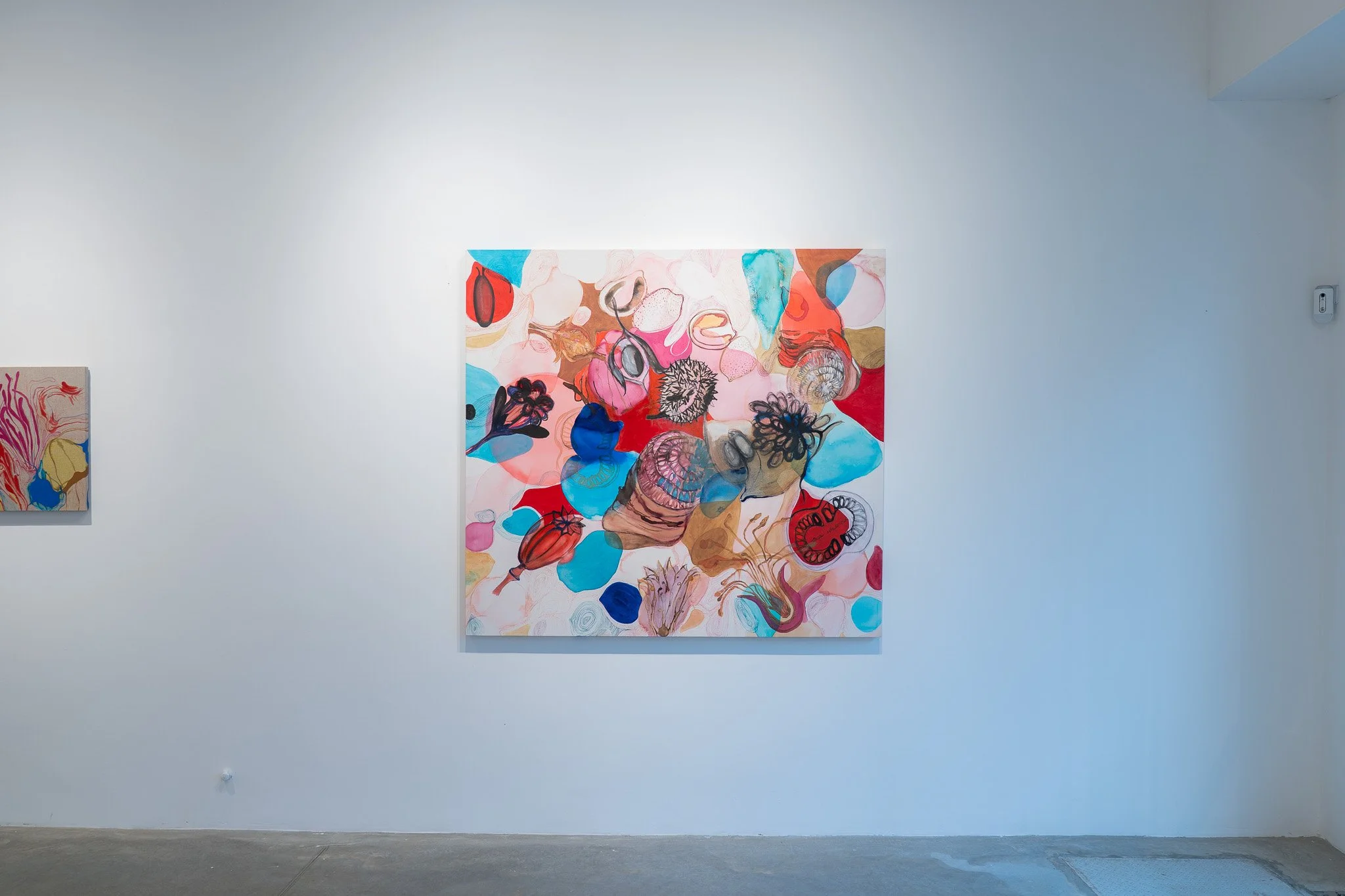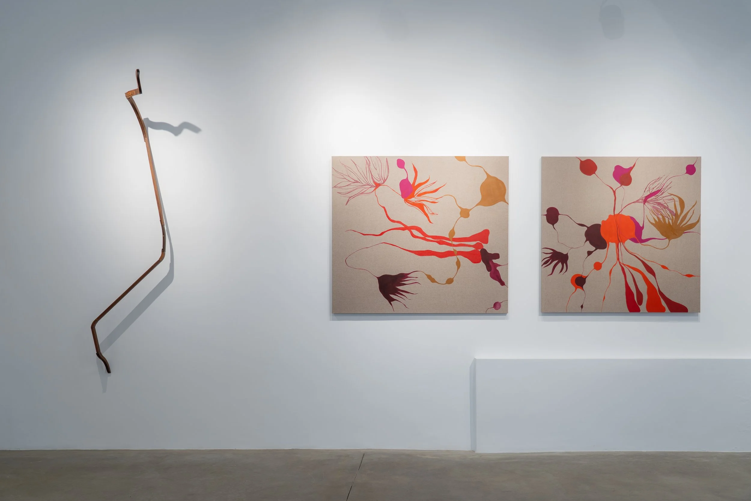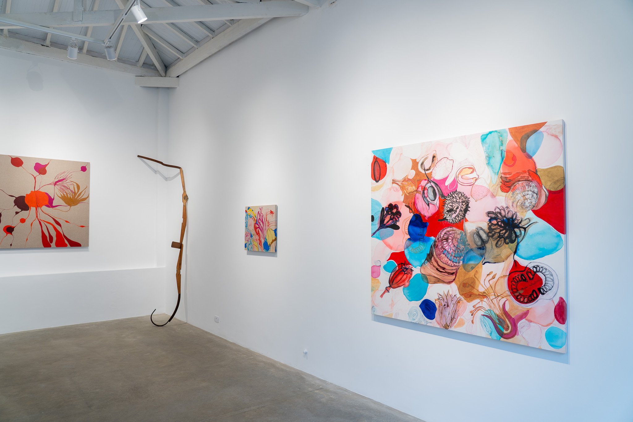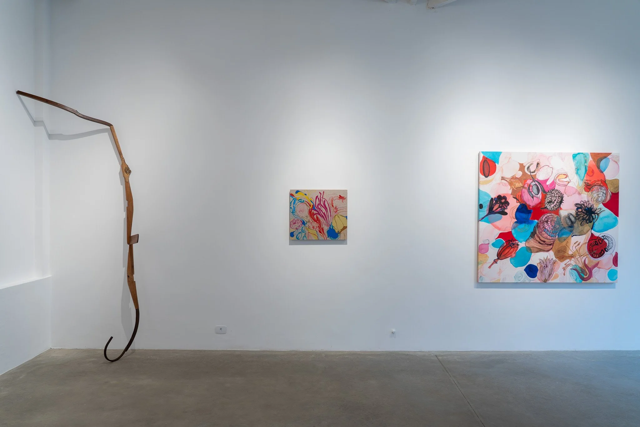 As obras partem de uma base figurativa que rapidamente se tensiona e se dissolve em camadas sobrepostas, transparências e infiltrações. Linhas quase imperceptíveis atravessam as composições, conectando formas e instaurando relações subterrâneas entre figura e fundo. As fronteiras entre interior e exterior, superfície e profundidade, natural e artificial perdem nitidez.